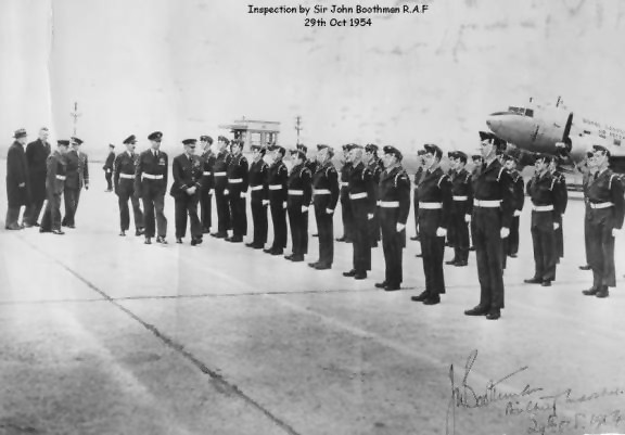 Conducting themselves like veterans, members of No. 588 Canadair Air Cadet squadron put on an impressive show when they formed a guard-of-honour for Sir John Boothman. Air Officer Commanding in Chief, RAF Coastal Command. In the above photo Sir John is seen inspecting the guard, which is drawn up on the tarmac outside plant-1. Accompanying the Air Chief Marshal is Flight Lieutenant Eric Simms, officer commanding the squadron, followed by Flight Lieutenant Harry Lynas the guard commander. At the rear the inspecting party, R. A. (Bob)Neale vice-president-manufacturing, and Peter Redpath,vice-president-sales who escorted Sir John during his tour of the plant. |
