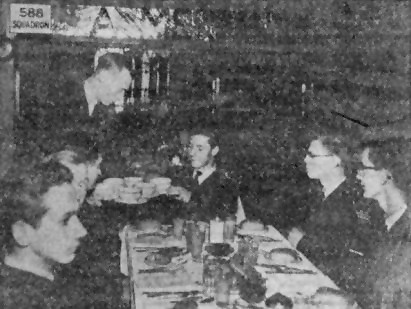 Premier dîner de Noël des cadets du Canadair Les cadets de l'alr des escadrilles 588 et 592 du Canadair ont été les hôtes de cet important fabrique d'avions, hier soir, lors du premier dîner de Noël offert par la compagnle à ses cadets. Les jeunes gens ont été servis, a cette occasion, par leurs supérieurs, selon la tradition qui existe déjà chez leurs aines, les membres du CARC. Dans Ia photo, le lieutenant d'aviation ERIC SIMMS, commandant de l'escadrille 588, présente le potage as cadet GEORGES VIGER, 17 ans, 1470, chemin Bois-Franc. Le dîner, qui fut suivi d'un programme de divertissement, état sous la présidence de M. R. A. Neale. Vice-président à la production de la compagnie. |
