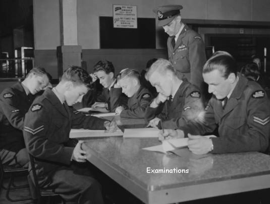 THE WHEELS ARE TURNING — A few of the more than eighty cadets who took examinations upon the completion of the required academic training of sixty hours per year. F/L Eric Simms, officer commanding No. 588 (Canadair) Squadron, keeps a watchful eye on (l. to r.) Corporal Ken Wiliamson, LAC John Reed, LAC George Purcell, LAC Robert Cairns, LAC Ken Brewin and Corporal Robert Prieur. Results will be recorded in next issue. |